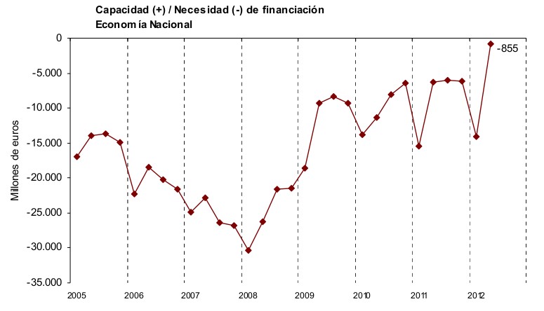 La economía nacional (familias, empresas bancos y sector público) presentó una necesidad de financiación externa de apenas 855 millones de euros en el segundo trimestre del año, casi 5.400 millones inferior a la registrada en el mismo período de 2011 y a años luz de los casi 30.000 millones del primer trimestre de 2008. Asimismo, entre enero y junio, la economía española acumuló una necesidad de financiación neta de 14.926 millones, tan sólo el 2,8% del PIB semestral.