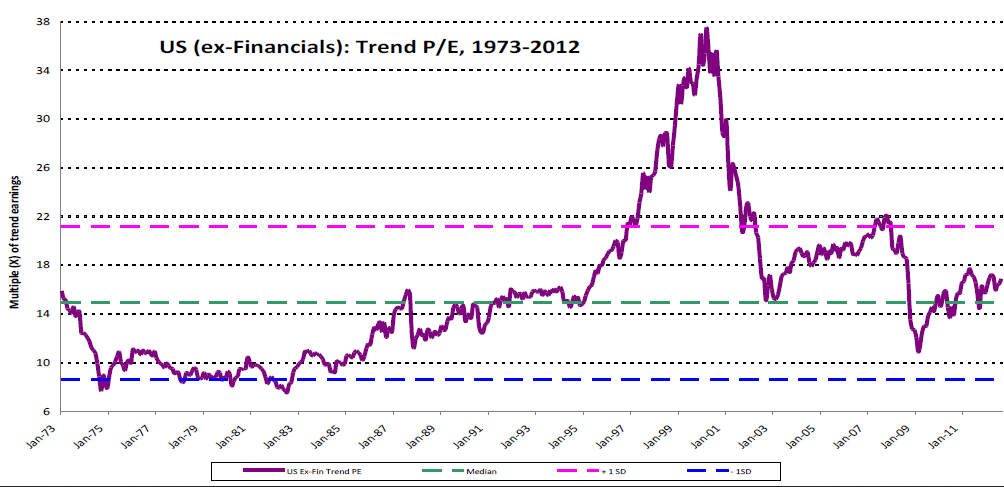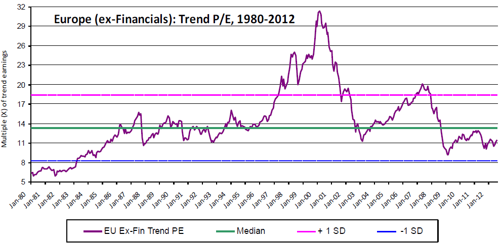 En los siguientes cuadros, realizados por Mirabaud 1819 en su Alerta Estratégica de agosto de 2012, podemos ver los múltiplos sobre beneficios (el inverso de la rentabilidad que ofrecen) al que han cotizado los grandes índices bursátiles de EEUU (un proxy del S&P500) y de Europa (E300), desde 1980 para el caso de Europa y desde el año 73 para EEUU.