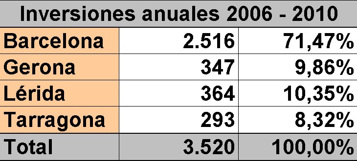 Como puede verse en la siguiente tabla, las inversiones reales de la Generalidad catalana en el período 2006-2010 ascendieron a una media de 3.520 millones de euros al año (más unos 304 millones "no comarcalizados", es decir, no imputables a ningún territorio en concreto). De esa cantidad, las comarcas de Barcelona se llevaron 2.516 millones, un 71,47%, diecisiete puntos menos de lo que en teoría les correspondería.