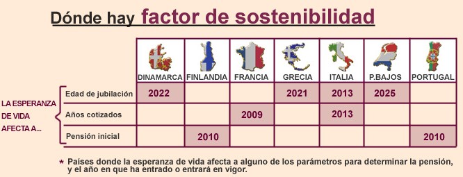 Países como Italia, Grecia, Dinamarca y Holanda revisan la edad de jubilación conforme a la evolución de la esperanza de vida; otros como Francia e Italia ajustan los años de cotización necesarios para cobrar pensión en función de la esperanza de vida; mientras que en Portugal y Finlandia lo que se revisa es el propio importe inicial de la pensión según la esperanza de vida. El siguiente cuadro resume la aplicación del "factor de sostenibilidad" en estos países y el año de su puesta en marcha.
