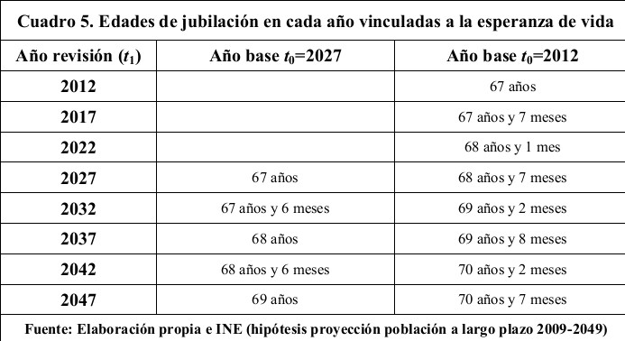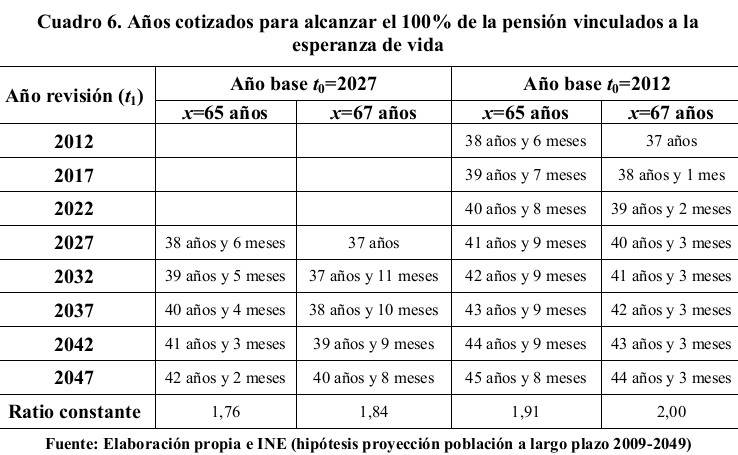 De este modo, si la reforma de 2011 exige cotizar 37 años para poder jubilarse a la edad de 67 cobrando la pensión íntegra, el "factor de sostenibilidad" exigiría cotizar 40 años y 8 meses en el horizonte de 2047 (si se usa 2027 como año base); y 44 años y 3 meses si dicho factor se aplicara ya (2012 como año base). Los resultados varían en función de la edad de jubilación (65 ó 67 años), ya que la normativa vigente permite jubilarse a los 65 con 38,5 años cotizados, de ahí que el siguiente cuadro recoja los resultados por separado.