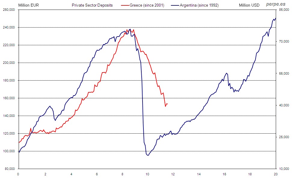 En Grecia se produce en estos momentos una situación similar de retirada de depósitos bancarios, provocada por el miedo que tiene la gente de la salida del país de la zona euro, con la consiguiente devaluación de la nueva divisa que se adopte. Desde el máximo de 237.824 millones de euros en septiembre del año 2009, los particulares han retirado, hasta el último dato en agosto, 84.426 millones de euros, una caída en porcentaje incluso más fuerte que en Argentina, alcanzando un descenso del 35,5%.
