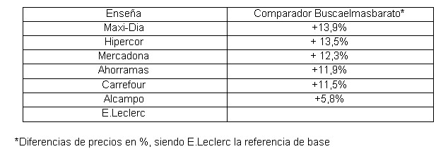 El primer listado de precios del comparador, realizado del 11 al 20 de septiembre de 2012, demuestra que E. Leclerc es la enseña más barata de la Comunidad de Madrid, con una diferencia de precio medio desde 5,8% hasta +13.9% respecto a sus principales competidores, Alcampo, Carrefour, Ahorramas, Mercadona, Hipercor y Maxi-Dia.