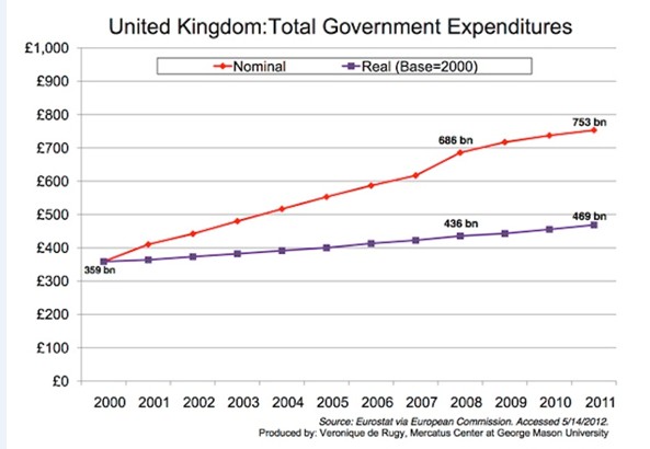 Es cierto que Cameron ha reducido en unos 40.000 millones de libras el déficit público (del 10,4% al 8,3%), pero es fundamental entender que el componente de este ajuste ha sido ejecutado, principalmente, vía subidas de impuestos. Como explicó en junio la economista Veronique de Rugy, "por cada tres libras de nuevos ingresos tributarios, apenas se ha recortado una libra de los presupuestos".