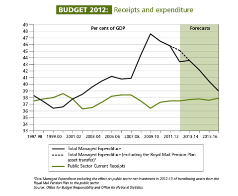 Midiendo el gasto público en porcentaje del PIB podemos apreciar que el peso del Estado sobre el resto de la economía de las islas apenas ha caído en dos puntos porcentuales. Este indicador llegaba al 47% del PIB en el último año de gobierno de Gordon Brown, mientras que la previsión para 2012 lo sitúa en niveles del 45%.