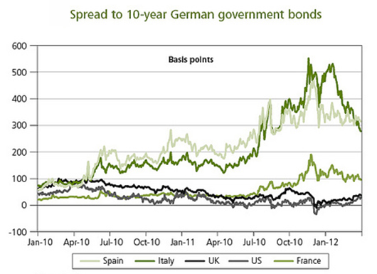 Pese a todo lo anterior, es justo señalar que el gobierno de Cameron sí ha conseguido trasladar una imagen más seria en materia de control presupuestario que el gabinete de su predecesor en el cargo, Gordon Brown. Esto se ha reflejado en la financiación de la deuda pública, que ha experimentado una cómoda caída en los últimos meses. La siguiente gráfica confirma esta evolución positiva.