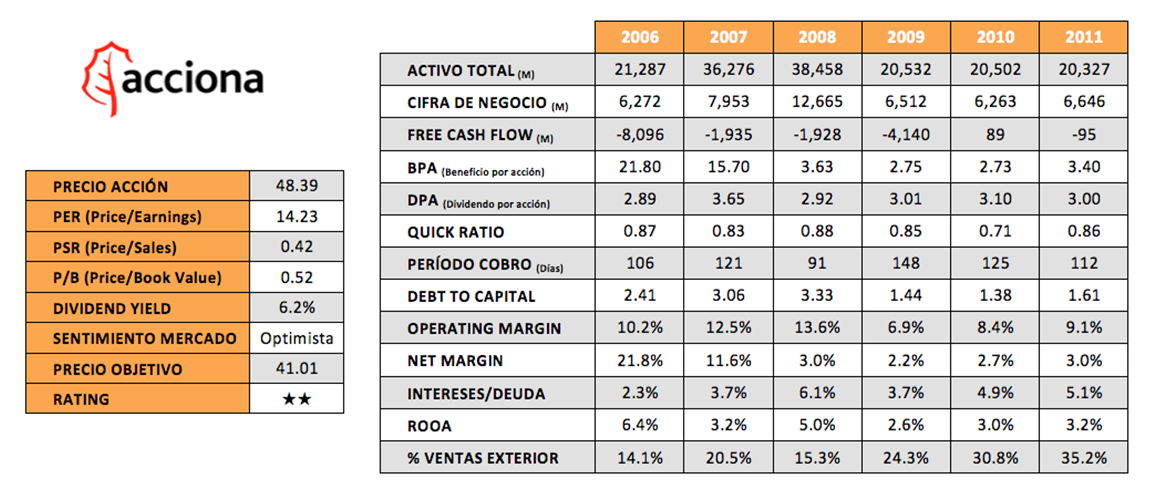 Con una rentabilidad de los activos claramente por debajo del coste del capital, con un resultado neto en el que el capítulo financiero juega un papel destacado y con un mercado que ya está descontando crecimientos importantes en el BPA a partir de 2013 -sólo así se podría justificar un precio cercano a los 50 euros a partir de un BPA estimado de 2.45 para el año 2013-, no veo yo a la acción de Acciona rompiendo los 50 euros. ¿Pronóstico? Bajista.