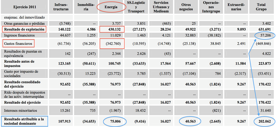 La energía y las infraestructuras representan el grueso de la actividad. Luego, a tenor de los datos mostrados, un WACC del 9% para el global de la actividad parece razonable. No obstante, a efectos de exposición, la historia no varía por un punto porcentual por arriba o por abajo. La conclusión es obvia: el negocio, al menos por ahora, no genera valor. Y no genera valor por cosas como las que encuentro en esta tabla -datos de la empresa a fecha de cierre de 2011, segmentados por área de negocio-: