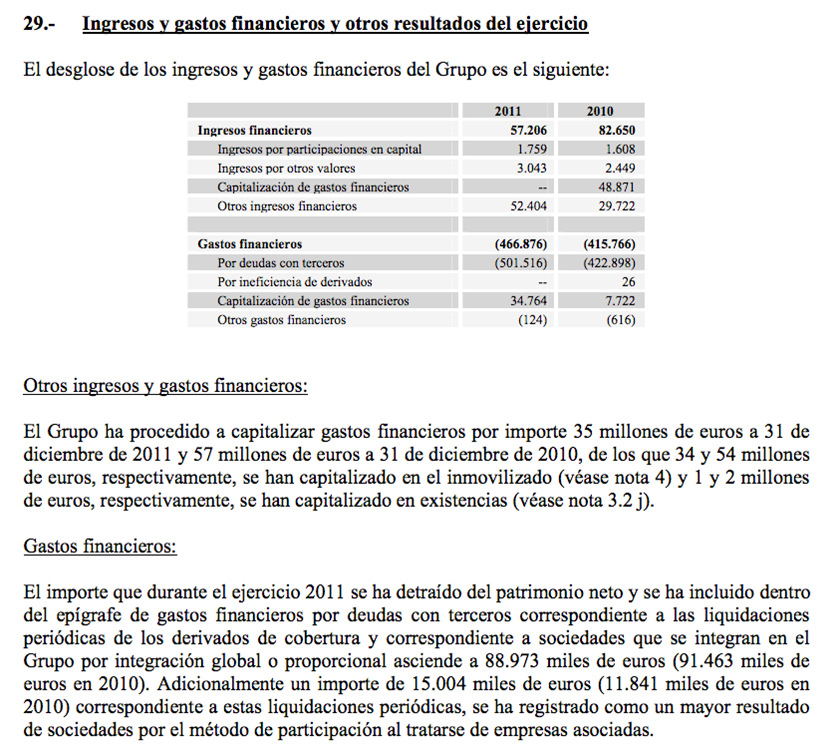 - Y miren por dónde, buceando en el resto de información de la nota me encuentro con otro dato inquietante: la empresa está capitalizando intereses por importes muy elevados. Para no liarle, le resumo qué es eso de la capitalización de intereses. La idea es simple: evitar que una parte de los intereses vayan a parar a la Cuenta de Resultados -se dejan dormidos en el Balance de Situación de la entidad, concretamente en el Activo-. Evidentemente, cuanto menor sea el gasto reflejado mayor será el beneficio. De entrada, en 2011 la capitalización de gastos asciende a 35 millones de euros. Esto es, de no haber capitalizado ese importe de intereses, el beneficio antes de impuestos sería 35 millones menor. Por no hablar de los 57 millones de euros capitalizados en el 2010.