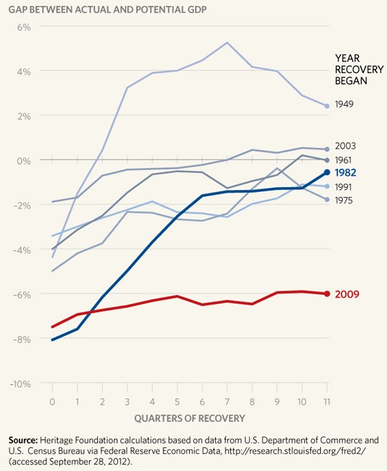 Las políticas de estímulo fiscal y las nuevas regulaciones no han logrado que el PIB estadounidense regrese a los niveles previos de la crisis, pero sí han situado la libertad económica de EEUU en mínimos históricos. De hecho, los datos muestran que la primera economía del planeta registra hoy la recuperación más lenta desde la Gran Depresión de los años 30.