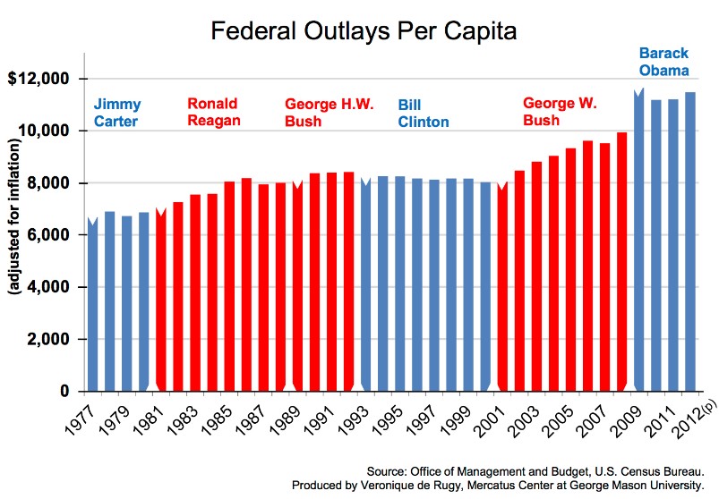 Y todo esto se ha producido a pesar de que el Gobierno federal ha aumentado el gasto público para combatir la crisis. Obama ha situado en niveles récord de los últimos 40 años el gasto federal per cápita.