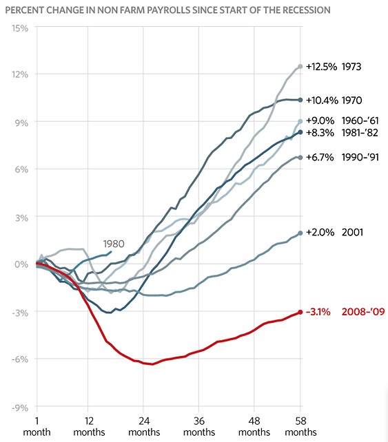 En las anteriores recesiones, el empleo se recuperó en una media de cuatro años desde el inicio de la crisis, pero hoy en día EEUU aún cuenta con 4,2 millones de trabajadores menos que a finales de 2007. El mercado laboral estadounidense también está experimentando la recuperación más lenta desde los años 30.