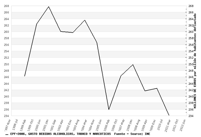 La segunda categoría es el consumo de bebidas alcohólicas y tabaco, en que las fortísimas subidas de impuestos han hecho que el gasto sólo caiga un 6,4%.