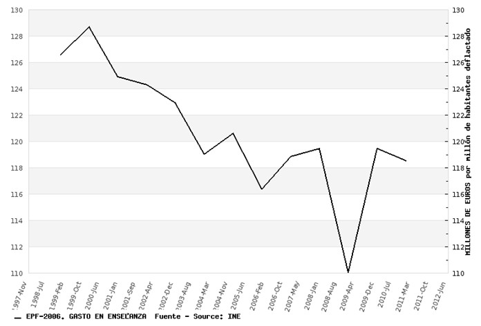 A continuación, está el gasto en enseñanza. La falta de expectativas laborales (que hacen que ahora sea más prioritario que nunca formarse) y las subidas de tasas han provocado que el gasto en este sector sea virtualmente el mismo que en 2007.