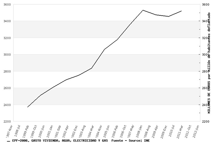 Y en último lugar, tenemos los gastos en vivienda, agua, electricidad y gas, que son incluso ligeramente superiores a los de 2007. Las enormes subidas de precios aplicadas, motivadas en parte por los altos precios de la energía y también por el comportamiento oligopólico de las compañías y la toma de medidas contra la subida imparable del déficit de tarifa han provocado que esta situación.