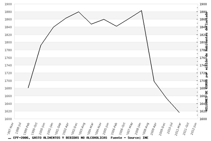 Por desgracia, cuando analizamos más de cerca en qué nos gastamos los españoles este dinero aparece un cuadro bastante más siniestro sobre lo que está suponiendo esta crisis para nuestro nivel de vida. Esto aparece reflejado con toda su crudeza en la estadística de gasto en alimentos, que ha caído un 13,9% y se encuentra un 3,7% por debajo del de 1998. Llama muchísimo la atención que esto ocurra en un gasto, en principio, tan inelástico como es la comida, lo que da cuenta de los grandes problemas económicos que están afectando a buena parte de la población.