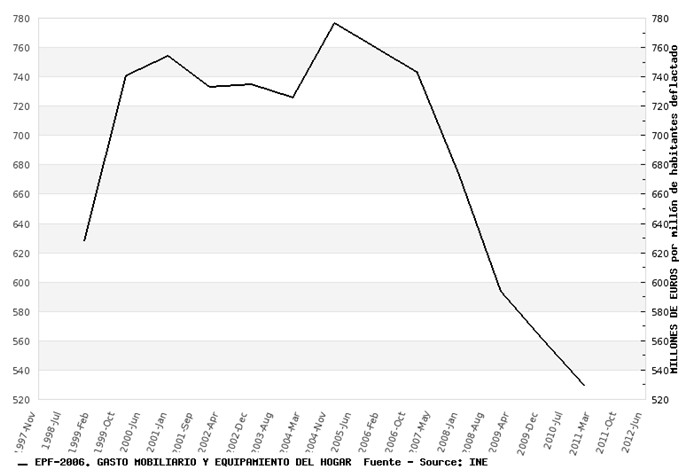 Aún peor es la evolución del gasto en mobiliario y equipamiento del hogar, que baja un 32,1% y es un 15,9% menor que en 1998.