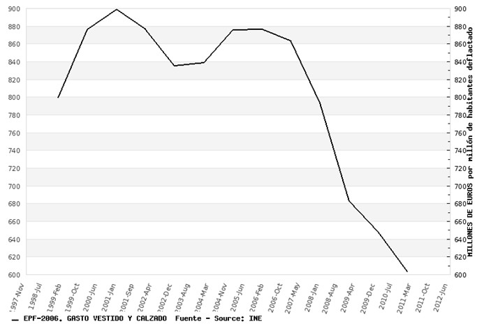 El gasto en vestido y calzado ha tenido también una evolución muy desfavorable, un 30,2% menos que en 2007 y un 15,9% menos que en 1998.