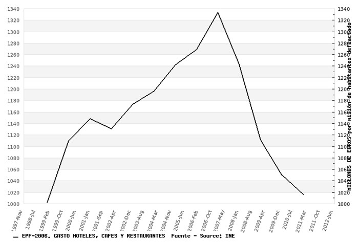 Otro sector que está padeciendo de una forma durísima la crisis es el de la hostelería. Los españoles gastamos un 23,3% menos que en 2007, y sólo ligeramente más que en 1998.