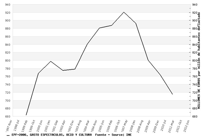 El gasto en espectáculos, ocio y cultura no ha corrido mejor suerte, habiendo bajado un 20,7% desde 2007, aunque aún se mantenía en 2011 por encima del de 1998.