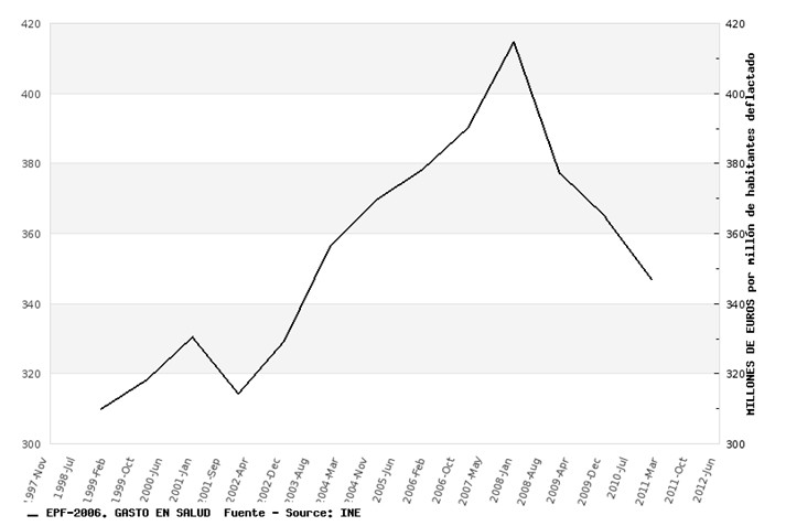 El gasto en salud (que es una partida muy reducida de los presupuestos familiares dada la amplia, hasta la fecha, cobertura del sistema público de salud) se reduce también con fuerza, aunque menos que otras partidas: un 18,2% respecto a 2007. Hay que tener en cuenta que el envejecimiento de la población, y el hecho de que los mayores son los que menos han sufrido la crisis hasta ahora (como expone claramente esta encuesta) hace que esta caída sea mucho más significativa de lo que a primera vista pudiera parecer.