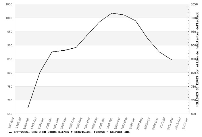 Las familias españolas -siempre hablando en euros de 2011- gastaron el pasado año algo más de 11.200 euros por habitante. El descenso desde 2007 (año en que se dio el mayor gasto) es de casi 2.000 euros, es decir, nada menos que un 14,3%, lo que nos lleva a niveles en gasto total propios del año 2000. Llama muchísimo la atención que esta caída sea mucho mayor que lo que se suele reconocer en otras estadísticas (como el PIB) como pérdida de riqueza del país en estos ejercicios.