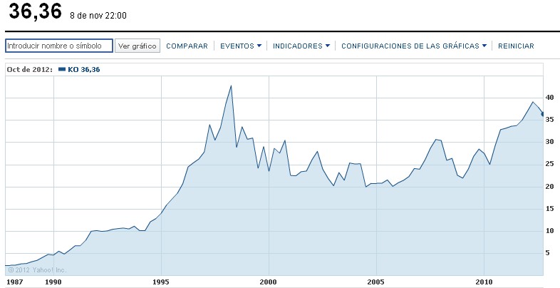 Primero, echemos un vistazo a la cotización en bolsa de las dos firmas. De 1990 hasta 1998, cuando alcanzó su valor máximo, Coca-Cola experimentó una revalorización del 750%. A partir de entonces, sus acciones decrecieron considerablemente, y se han mantenido constantes hasta ahora, que han vuelto a subir.