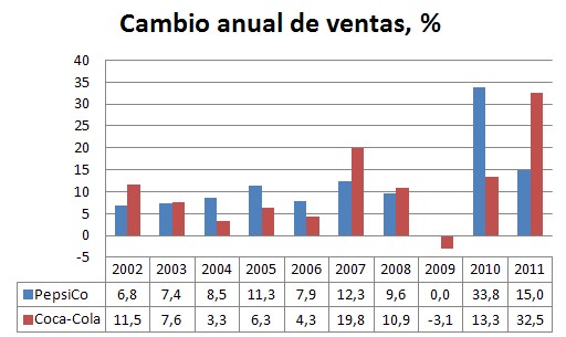 El siguiente gráfico muestra el cambio anual de las ventas totales de PepsiCo y Coca-Cola. El crecimiento que han experimentado se asemeja bastante. Sin embargo, quizá les sorprenda saber que la primera tuvo en 2011 unos ingresos totales un 43% superiores a los de su competidor.