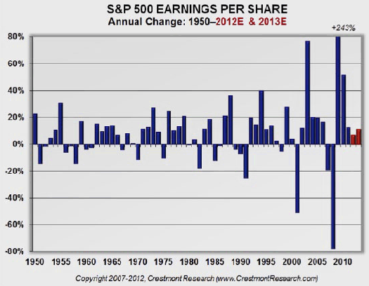 ¿Ha sido esta caída sintomática de lo que nos espera en los próximos tiempos o se trata de un ajuste menor dentro de una tendencia alcista? Nos vamos a aventurar a dar un pronóstico para 2013 a tenor de los indicios que se pueden extraer de la situación económica y política de EEUU. A riesgo de equivocarnos, nuestro augurio es que en 2013 se producirá una corrección significativa (probablemente superior al 20%) en la bolsa norteamericana.