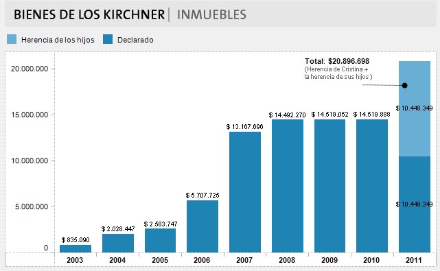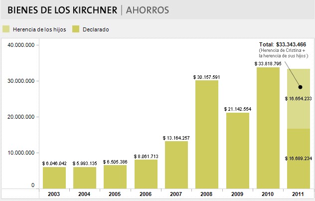 Fue en mayo de 2003, momento en que Néstor Kirchner asumió la Presidencia de la nación, cuando comenzaron a engordar las cuentas de estos dos abogados de profesión. La cifra incluye, a fines comparativos, los bienes que heredaron sus hijos por la sucesión que la presidenta hizo tras la muerte de su marido. Así se desprende de la serie de declaraciones juradas que los mandatarios presentaron ante la Oficina Anticorrupción (OA) según informa el diario argentino La Nación.
