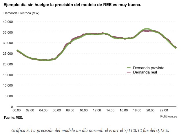 Y es que, el único dato fiable y, por tanto, válido a la hora de valorar la incidencia de este tipo de convocatorias no es, en ningún caso, el número de trabajadores que la secunda (dato imposible de cuantificar de forma precisa) sino la evolución real del consumo eléctrico respecto a la previsión oficial de demanda por parte de Red Eléctrica Española (REE) para un día normal (en ausencia de huelga).
