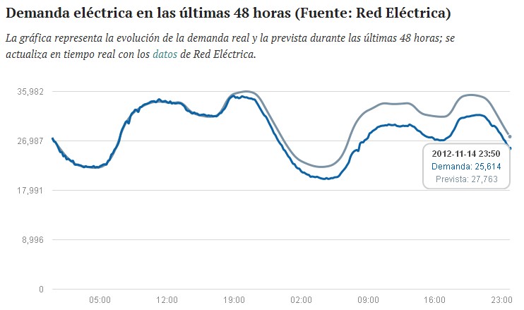 La huelga del 14-M comenzó de forma oficial a las 00:00 horas de la pasada noche. A la 1 de la mañana la demanda eléctrica registraba una caída del 6% respecto a la prevista por REE, inferior pues a la registrada en la pasada convocatoria sindical del 29 de marzo (9%) y similar a la del 29 de septiembre de 2010 (6%). Pero estos datos eran aún muy prematuros.