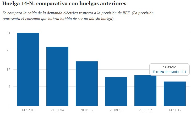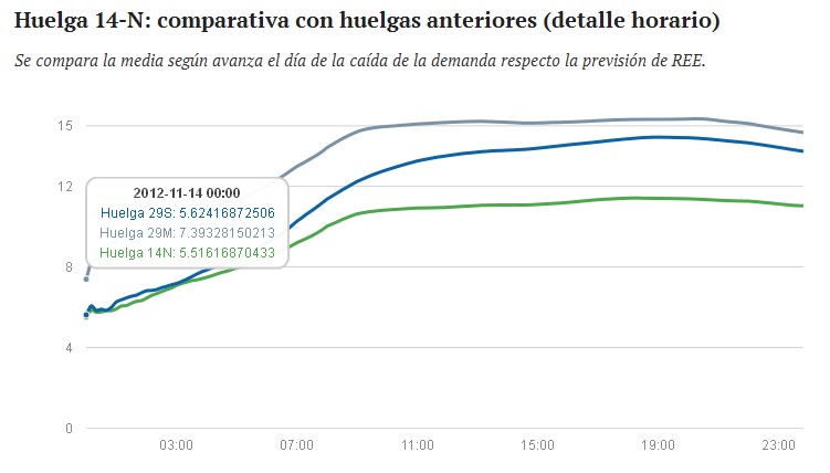 A las 8 de la mañana, la demanda era ya un 10% inferior a la prevista, por debajo de la caída registrada el 29-M de 2012 (14%) y cercana a la del 29-S de 2010 (11%). Todo ello contrasta con el desplome del consumo eléctrico en las huelgas generales de años previos (1988, 1994 ó 2002), en donde se experimentaron caídas superiores al 20% a esas mismas horas.