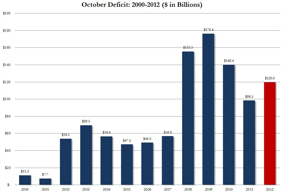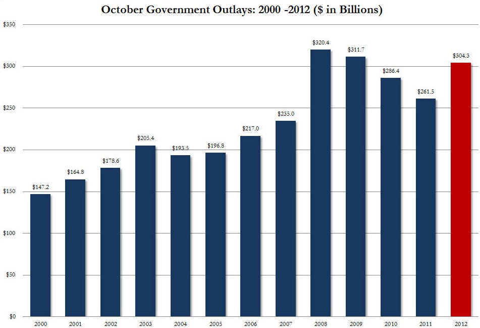 Sólo ese mes, el Gobierno de Obama gastó 304.000 millones de dólares, el tercer mayor gasto mensual de la historia en un mes de octubre, muy próximo a los 320.000 millones registrados en octubre de 2008, tras la quiebra de Lehman Brothers.