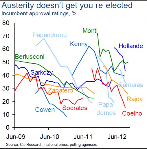 Todos los gobiernos que se han visto obligados a adoptar medidas impopulares contra la recesión y el déficit han visto cómo se desplomaba su popularidad en las encuestas, hasta el punto de perder el poder. La austeridad no ayuda a ser reelegido, según los analistas de Citigroup, al menos en los países periféricos -incluida Francia-.