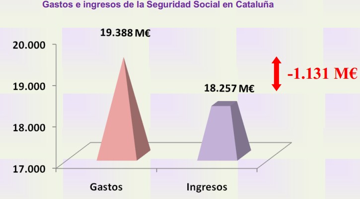 Por todo esto, en el último ejercicio publicado, 2011, en Cataluña se gastaron en pensiones y otras prestaciones 19.388 millones de euros mientras que las cotizaciones sociales pagadas por cotizantes catalanes sumaron sólo 18.257 millones.