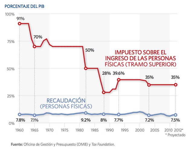 Numerosos economistas han explicado que el incremento de los tipos impositivos no siempre conlleva un aumento de la recaudación fiscal. La curva de Laffer nos indica que existe un punto de resistencia a partir del cual las subidas tributarias dejan de generar más ingresos al Fisco. Aunque Krugman lo desconozca, Estados Unidos es un buen ejemplo de esto. La siguiente gráfica muestra que los elevados tributos aplicados a las rentas más altas durante los años 50 y 60 generaban la misma recaudación que el actual gravamen del 35%.