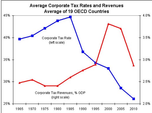 Krugman también sugiere que doblar el Impuesto de Sociedades podría ser otra buena forma de conseguir la "justicia económica" de la que habla en su artículo. No obstante, semejante receta tendría consecuencias muy similares a las que hemos descrito para el Impuesto sobre la Renta. Entre 1985 y 2010, los países de la OCDE pasaron de fijar el tipo máximo del Impuesto de Sociedades del 45% al 25%. Durante este mismo periodo, la recaudación tributaria, medida en porcentaje del PIB, se mantuvo entre el 2,5% y el 3%, niveles similares e incluso superiores a los registrados entre 1965 y 1985.