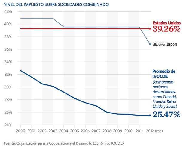 Tampoco menciona que la fiscalidad soportada por las empresas estadounidenses es claramente superior a la del resto de países de la OCDE. El 39,26% de EEUU contrasta con el 25,45% del resto de países desarrollados. Esto sugiere que el país norteamericano puede estar alimentando su propia deslocalización y desindustrialización manteniendo una fiscalidad empresarial tan poco competitiva.