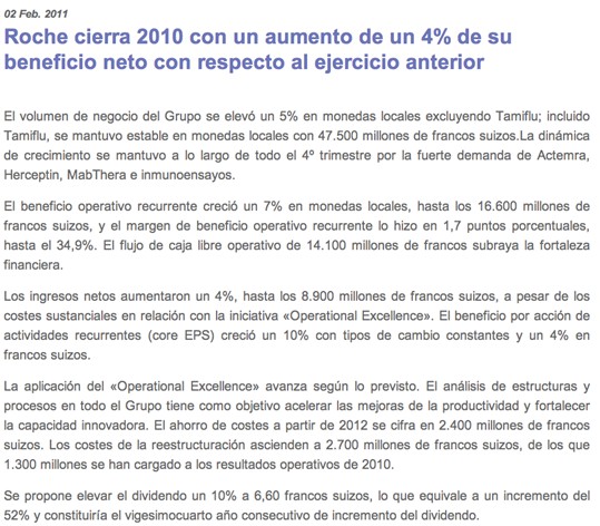 En primer lugar, me puse manos a la obra -manos a Google quiero decir- e indagué sobre la empresa. Rescato el siguiente extracto de un artículo de la prensa económica en el que hablaba sobre Roche.
