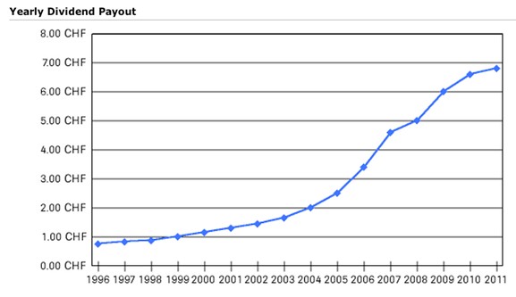 "Esto de Roche hay que verlo con calma", me dije. Y me fui directo a su página web a devorar información. En mente, dos objetivos: por un lado, recabar más información sobre el histórico de dividendos de la empresa; por otro, descargarme las Cuentas Anuales de los últimos años. De las Cuentas Anuales no toca hablar hoy aquí. Sólo les diré que los fundamentales son excelentes. Respecto a los dividendos, la web nos suministra una tabla que yo, al menos, me llevaría a una isla desierta. Es ésta:
