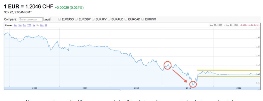 Otra lección de macro: la intervención de los Bancos Centrales. No hay más que ver el estrecho canal en el que se ha movido el tipo de cambio EUR/CHF desde que el Banco Central Suizo decidió intervenir.
