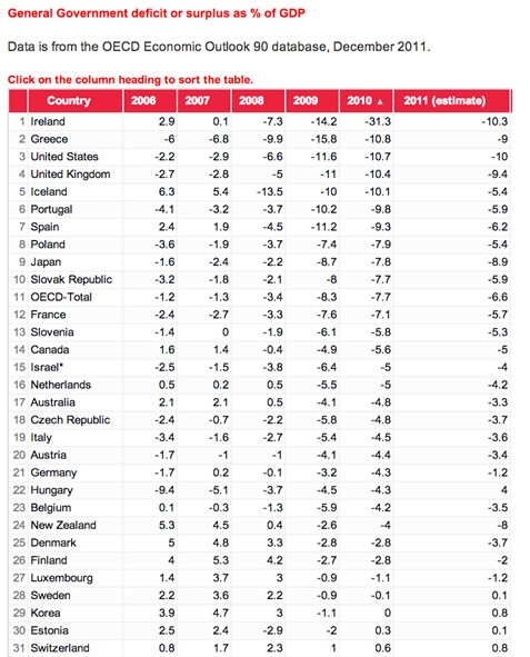 Seguimos indagando, y aprendiendo. Mi intención estaba clara: ¿qué cifras de déficit público se manejaban tanto en la zona Euro como en Suiza? La Organización para la Cooperación y el Desarrollo Económico (OCDE) tiene a bien facilitarnos los datos en su página web. La tabla que les muestro a continuación se ha confeccionado utilizando esos datos: