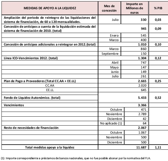 El retraso del dinero que Cataluña tenía que haber devuelto al Estado como resultado de los recursos recibidos de más en 2008 y 2009 a través del sistema de financiación autonómica ha supuesto una ayuda de 330 millones de euros; los anticipos a cuenta de la liquidación correspondiente a 2010 suman otros 945 millones; los anticipos adicionales del sistema aplicados en 2012 ascienden a 1.010 millones; la línea ICO para cubrir vencimientos fue de 1.304 millones; el Plan de Pago a Proveedores -incluyendo Generalidad y ayuntamientos catalanes-, 2.665; y el Fondo de Liquidez Autonómico (FLA) otros 5.433 millones. En total, casi el 1,1% del PIB de España.