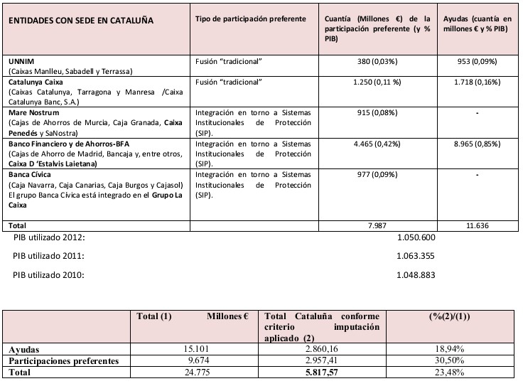 Este importe cubre las inyecciones de capital y ayudas extra facilitadas a las siguientes entidades financieras con sede en Cataluña: Unnim (fusión de Manlleu, Sabadell y Terrassa), Catalunya Caixa, Penedés (integrada en mare Nostrum), Laietana (integrada en Bankia) y Banca Cívica (integrada en el Grupo La Caixa).