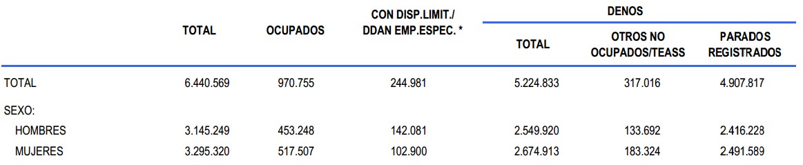 De esta manera, la cifra oficial de parados supera por primera los 4,9 millones, nuevo récord del registro. Pero como cada mes, hay que analizar también los datos sin el maquillaje estadístico que se inventó el Gobierno socialista para sacar de las listas a medio millón de personas. De esta manera, si a la cifra oficial le sumamos los parados con "disponibilidad limitada" y los llamados "denos" (demandantes de empleo no ocupados), tenemos 5.469.814 desempleados. En realidad, esta cifra es muy parecida a la que mostraba la Encuesta de Población Activa (EPA) publicada hace unas semanas y que suele considerarse como un indicador mucho más fiable de la cifra real de desempleados.