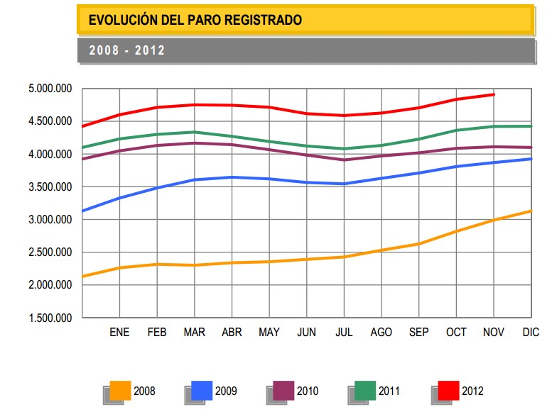 Tanto en términos oficiales como mirando las cifras sin maquillaje, este mes de noviembre se ha alcanzado el nivel más alto en toda la serie histórica comparable, que arranca en 1996, según informó este martes el Ministerio de Empleo y Seguridad Social. Hace apenas cinco años, en 2007, el número de parados registrado estaba por debajo de los 2.100.000. A partir de ahí, la cifra se ha disparado: en el mismo mes de 2008 ya rozaba los 3 millones, en 2009 se quedaba a las puertas de los 4 millones, una cifra que rebasaba ampliamente en 2010 (incluso a pesar del maquillaje estadístico que se introdujo ese año).