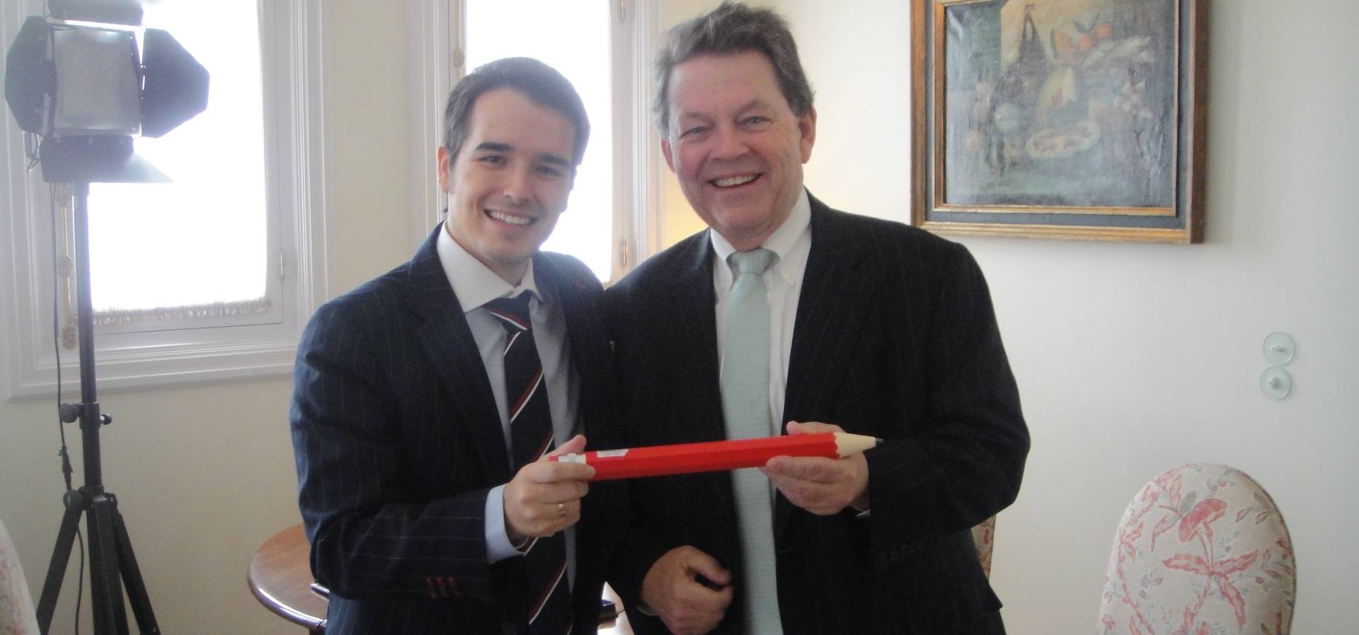 LM: Déjeme empezar con una sorpresa. A Vd. le gusta decir que solamente necesita un lápiz rojo para arreglar los presupuestos públicos de los países que han incurrido en un déficit descontrolado. Por eso queremos hacerle entrega de un lápiz rojo... pero de tamaño XXL, porque confiamos en usted pero nos tememos que hay mucho que recortar.