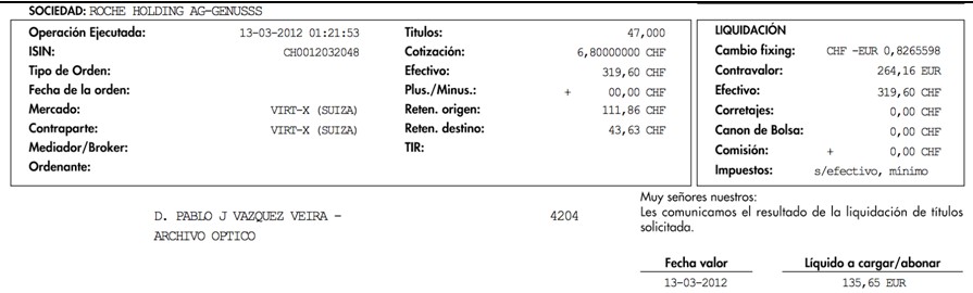 En primer lugar, reconozco que invertí sin tener en cuenta la normativa tributaria en materia de dividendos. Roche me parecía una excelente inversión: buenos fundamentales, referencia no sólo ya en el ámbito farmacéutico sino también en el de la diagnosis, un sector castigado por la mora de la Administración, buenos dividendos. En fin, me lancé sin importarme que el Fisco compartiera los réditos de mi inversión. Pero claro, una cosa es compartir y otra abusar. Vean la foto y luego seguimos hablando.