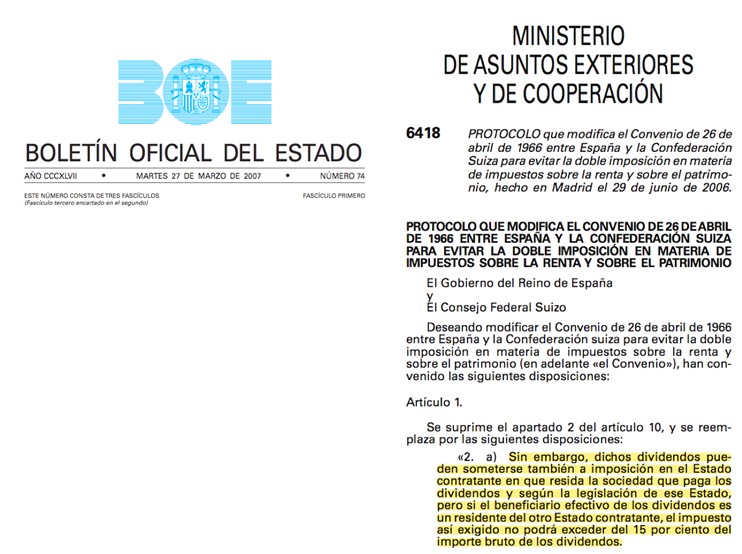 Pero pensé que tendría que haber algún mecanismo para evitar la doble imposición, ¿o es que acaso, como diría Obélix, están locos estos europeos -él diría romanos-? Y yo esto de poner la otra mejilla no lo veo claro. Me puse a investigar, y sí, España tiene firmados multitud de convenios bilaterales en materia tributaria para evitar la doble imposición. En este enlace de la Agencia Tributaria se pueden consultar todos estos convenios. Y uno de esos países con los que ha habido fumata blanca es Suiza. Les muestro una foto del BOE que recoge la última modificación practicada al Protocolo inicial vigente desde 1966: